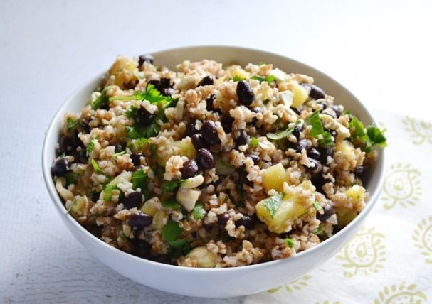 В состав блюда кроме ананасов входит булгур, который можно заменить пшеницей, кускусом, рисом или другими крупами, а также черные бобы. Если бобы замочить на ночь, то сварятся они гораздо быстрее. Заправку готовлю на основе сока лайма с добавлением оливкового масла и меда.
